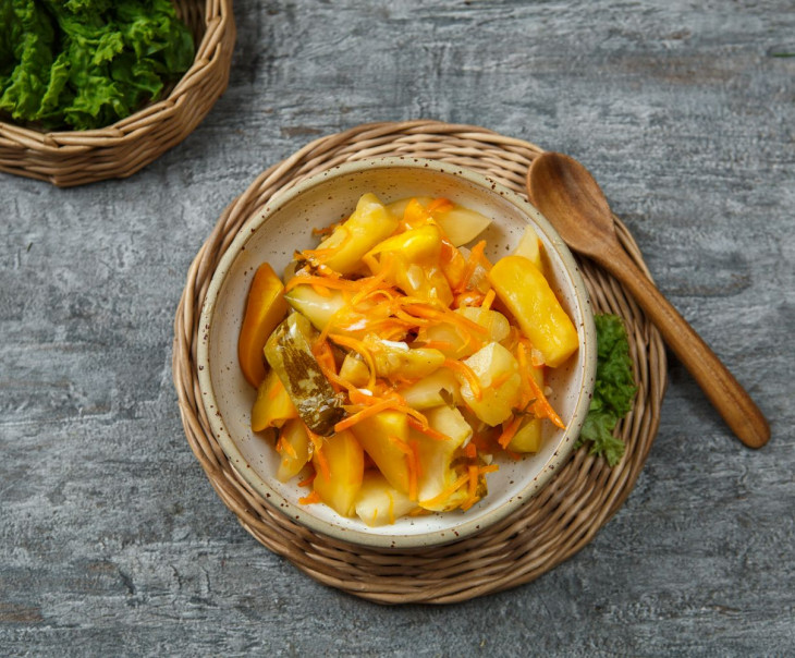 Состав: патиссоны, морковь, чеснок, зелень сельдерея, масло подсолнечное рафинированное, соль, сахар, уксус, перец черный молотый.