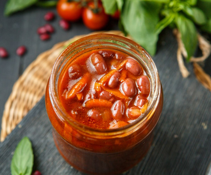 Состав: Зерно фасоли красной, подсолнечное масло, лук репчатый, морковь, черный перец, уксус пищевой, помидор (томат),соль поваренная пищевая, сахар.